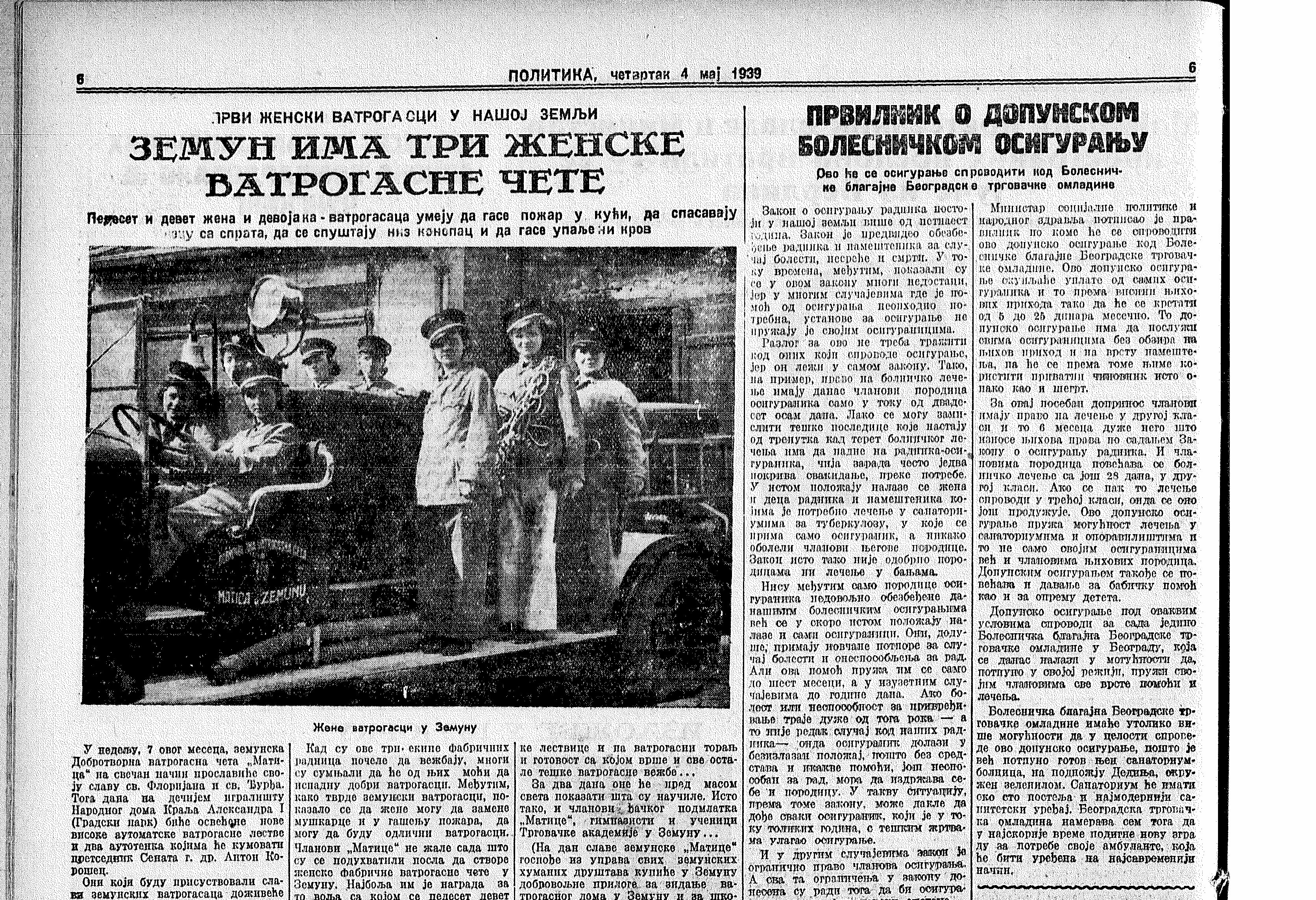 Земун је 1939. добио чак три женске ватрогасне чете ( 59 девојака и жена ). Земунке су били и "први женски ватрогасци у земљи”.