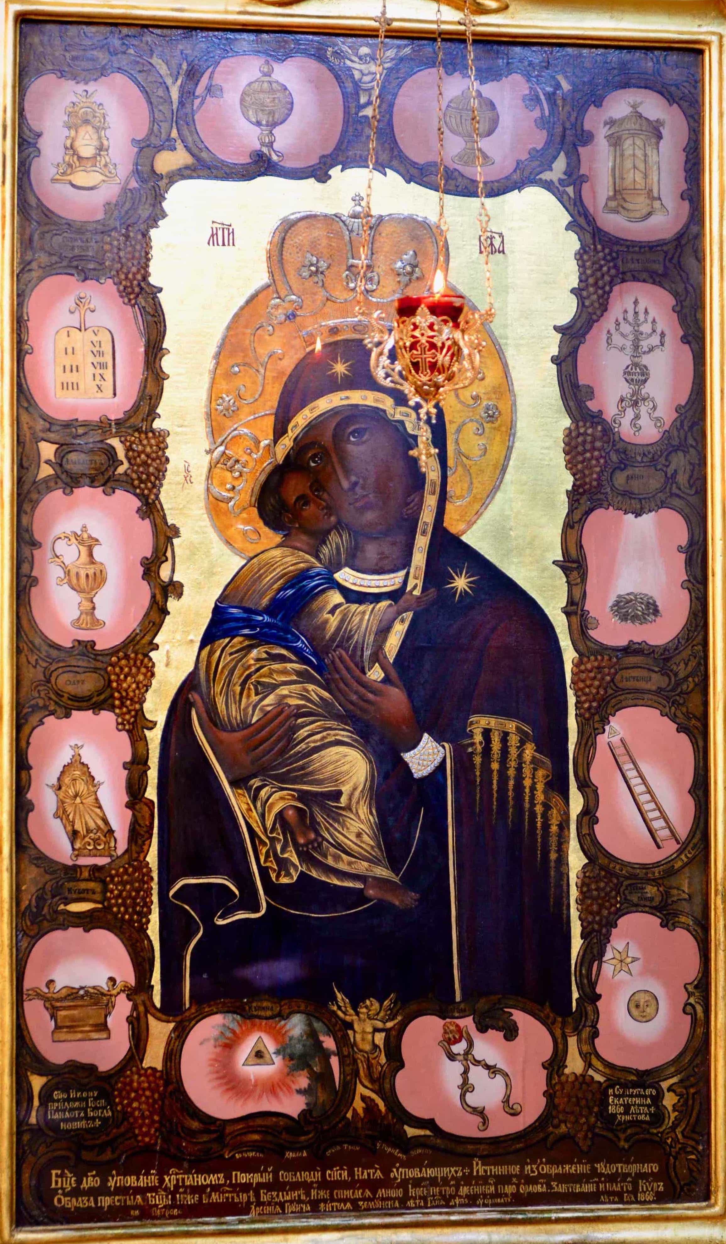 Посебну важност, за сведочанство историјске епохе, представља и монументална икона Богородице са Христом са метафизичким симболима.